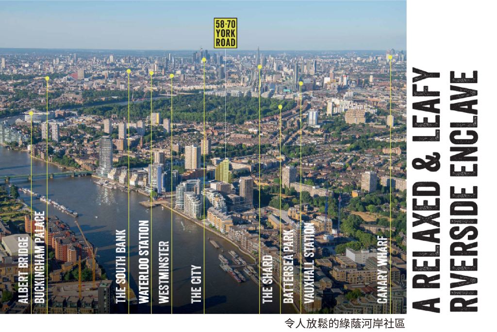 ◆ 59-70 York Road專案是由英國本地開發商Bmore精心打造的53套精品公寓樓,此地區很受英國本地人群尤其年輕中產階級喜歡,從樓盤穿過馬路便是泰晤士河岸,步行10分鐘可抵達巴特西小廣場,這裡有知名英國米其林三星大廚GOLDEN REMASEY的餐廳,各種品質咖啡廳,精品店。