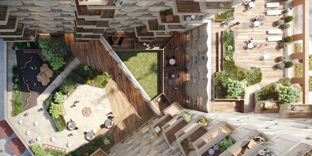 基地規劃:包括7棟新建築物,其中包括1,030棟新房屋,3棟新公共場所,共同辦公和辦公空間,一個新的保健中心和15棟零售空間。總體規劃由Allford Hall Monaghan Morris(AHMM)設計。